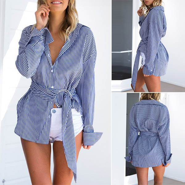 Make your wardrobe have an update by adding this shirt. It is designed with striped element,finished with long sleeve and POLO collar design,classic yet stylish. What's more,the waist strap design can easily enrich the design style as well as boost its entire charm. hen your wear it,your style can have a boost!