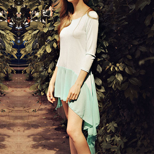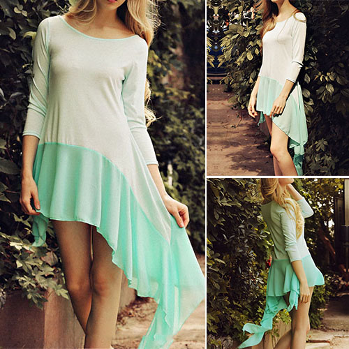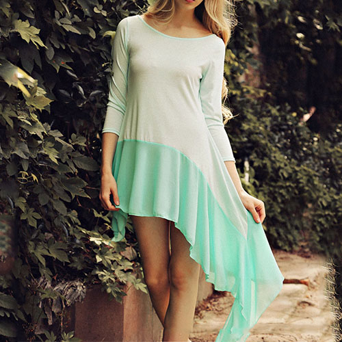 Contrast color design with chiffon spliced irregular hem make this dress look more distinctive,whilst its cozy fabric with long