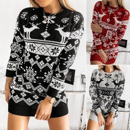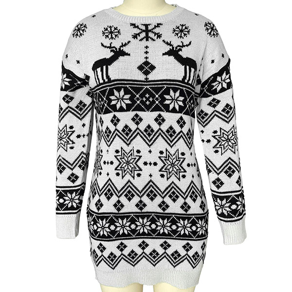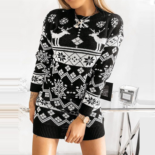 Fashion Long Sleeve Round Neck Elk Snowflake Pattern Knit Dress
