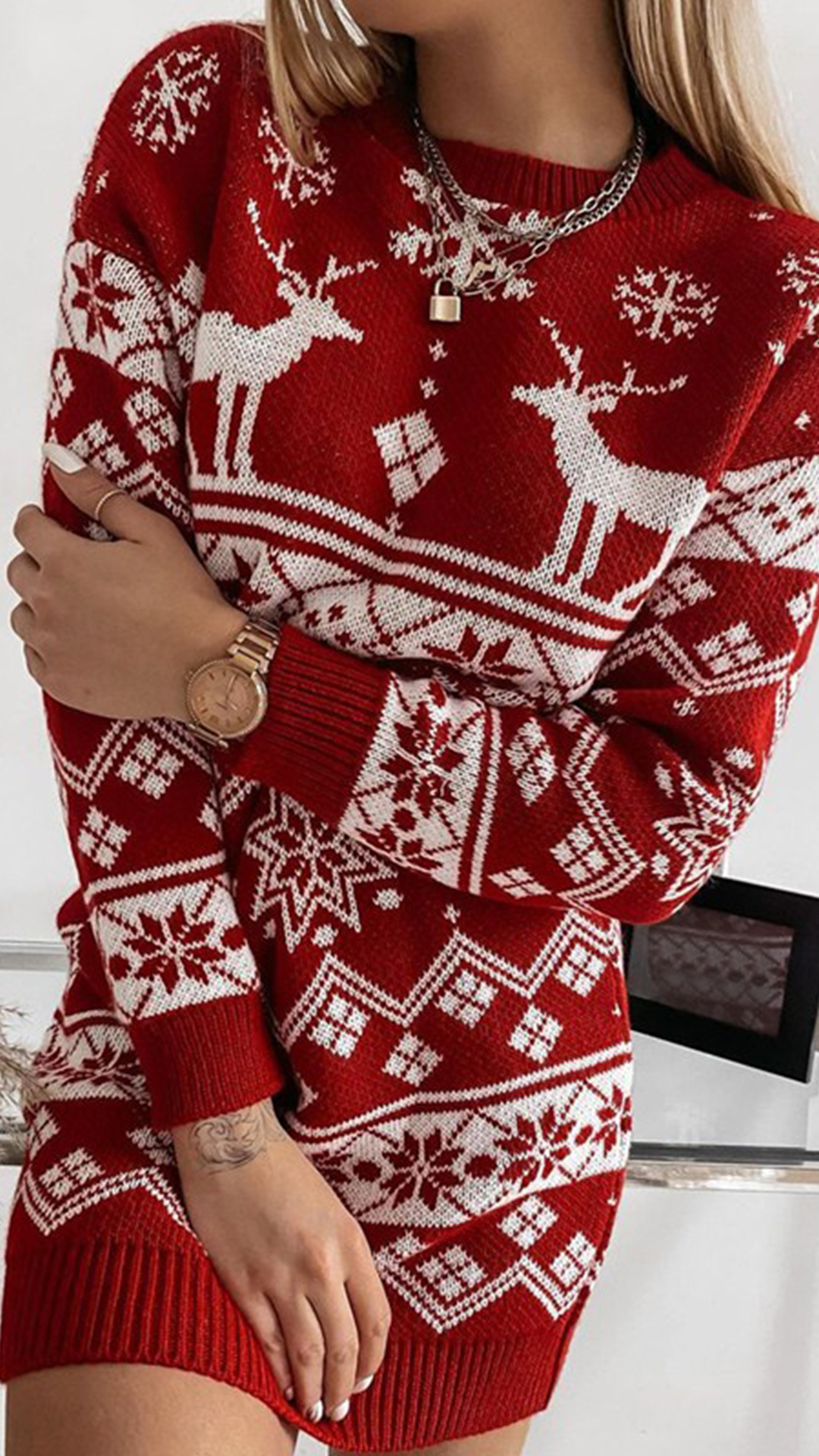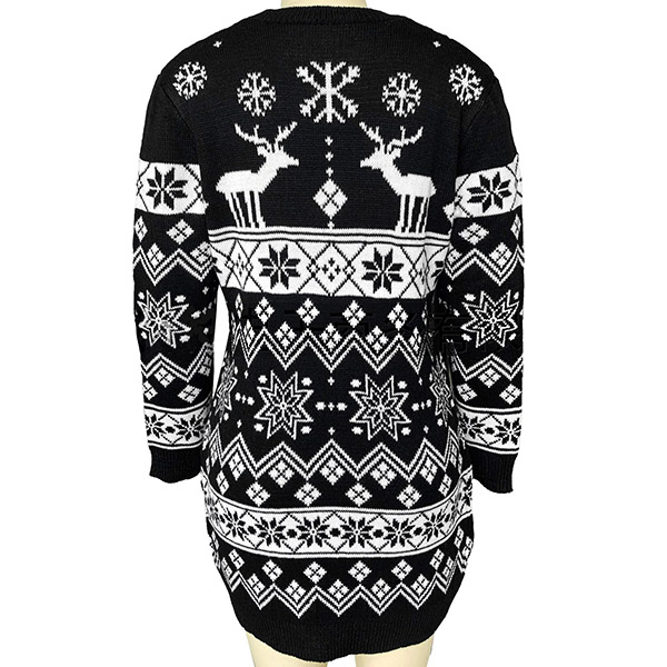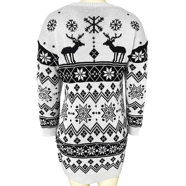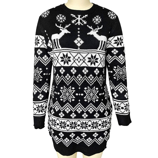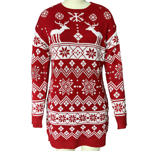 Give your wardrobe a seasonal update by adding this knit dress. The snowflake and elk pattern design make this piece look so lively and stylish. Finished with long sleeve,round neck and a clean,fit silhouette,this knit dress not only can keep you warm,but also can maintain your style. You can wear it alone or match with your jackets or overcoats.