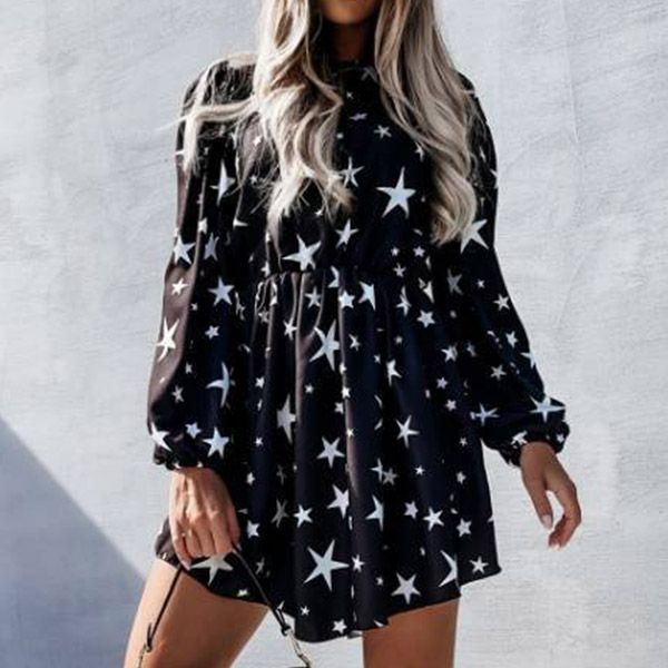 Thanks to the soft and breathable fabric,this dress can give you an all-day comfort. Moreover,the pentagram printed pattern design will make this piece look more eye-catching and stylish. Finished with long sleeve,round neck and gathered waist design,this dress is perfect fit for different occasions.