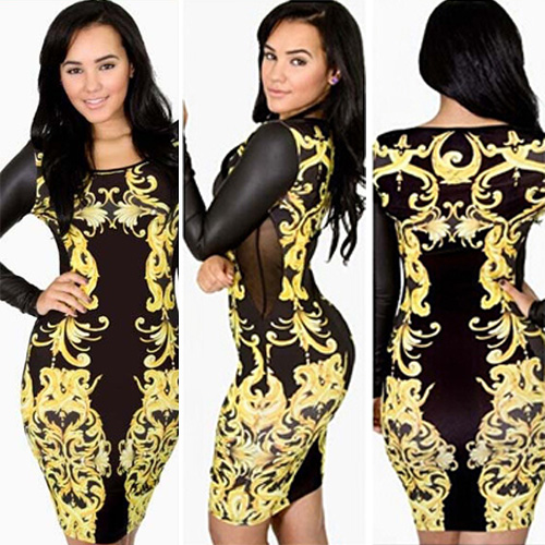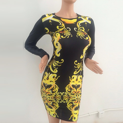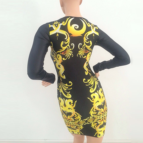 This dress is characterized by gold floral print pattern,chic and unique. Fashion round neck,long sleeve,slim fit and package hip design,perfect outline your charming figure.
