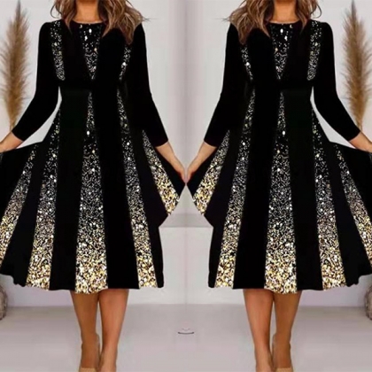 Fashion Long Sleeve Round Neck High Waist Sequin Dress