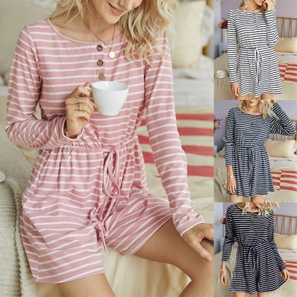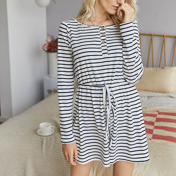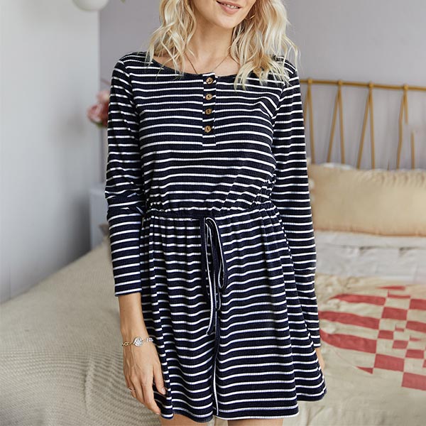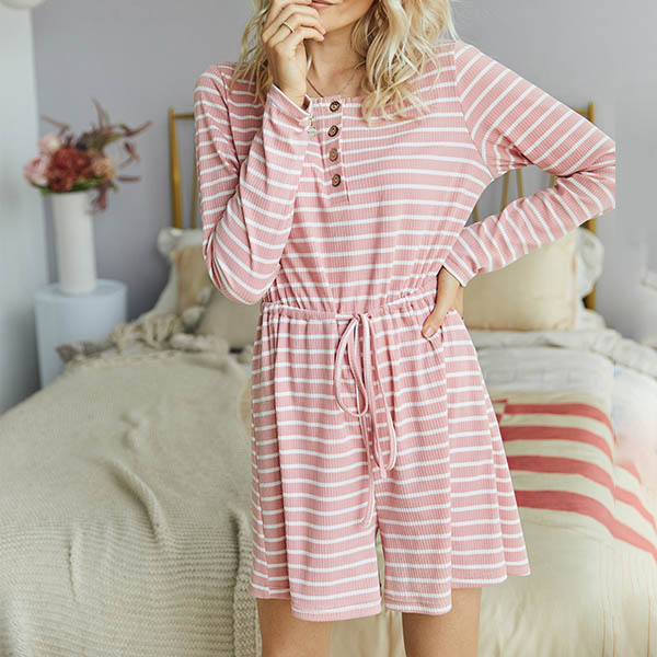 When you are tired of dresses,you can have a try different style piece such as this romper. It is designed with stripe element,finished with long sleeve,round neck and high waist design,this romper can showcase your slender figure as well as give your style an instant boost.