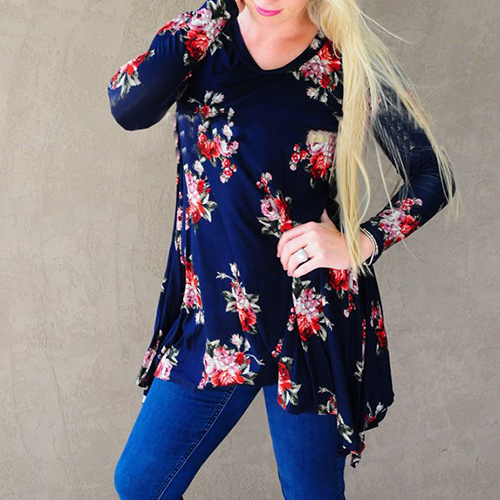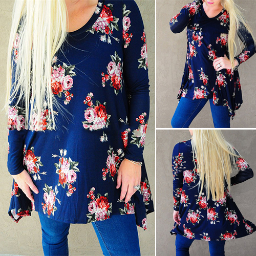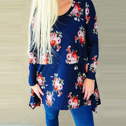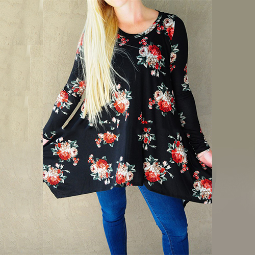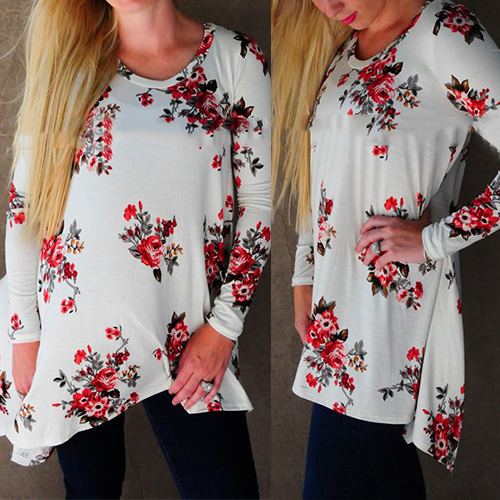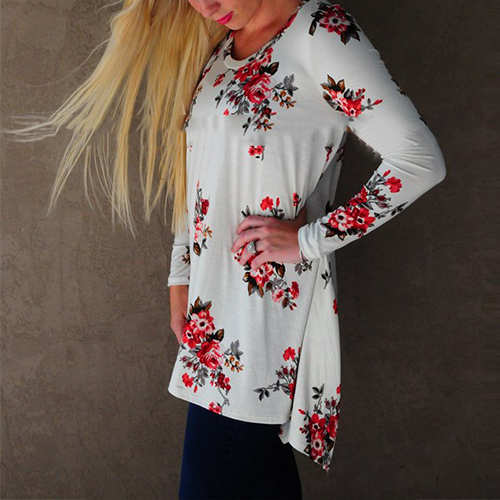 Fashion Long Sleeve Round Neck Irregular Hem Printed T-shirt