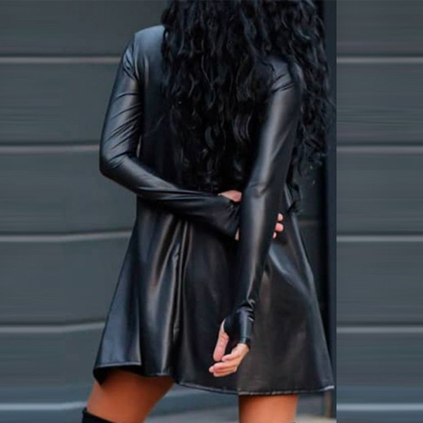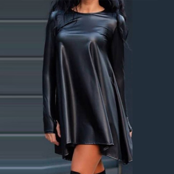 Wanna a chic and unique dress? Then make your eyes focused on this PU leather dress. Its irregular hem design makes this piece full of style and charm. Finished with long sleeve,round neck and breathable fabric,this piece also can give you a comfortable day. You can match it with your over-the-knee boots to achieve for a sassy and flirty look!