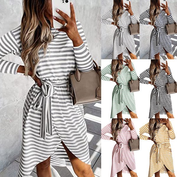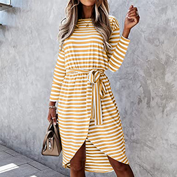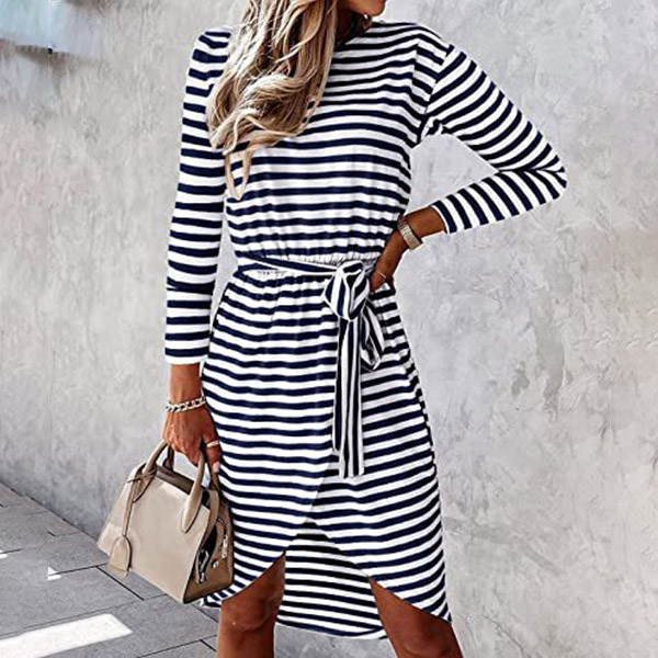 Fashion Long Sleeve Round Neck Irregular Hem Tie-belt Stripe Dress