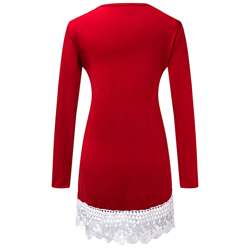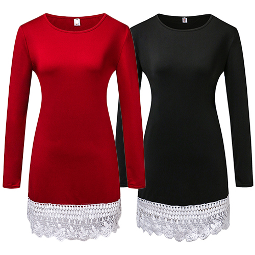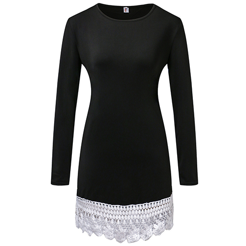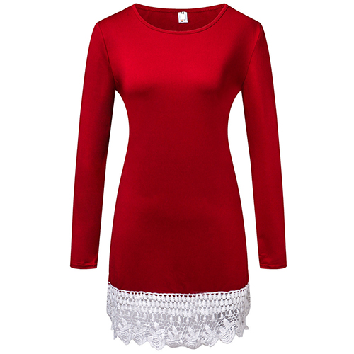long sleeve,round neck and a fit silhouette,lace spliced hem design adds some more feminine taste. This is a dress which can go a long way in your closet!