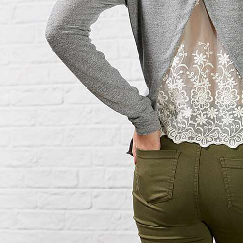 lace spliced design at back,which makes it more feminine. Perfect for pairing with any bottoms.