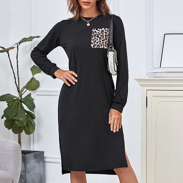 On your lazy days when you don't take too much time to do your wardrobe matching,then you can make your eyes focused on this dress. The slit hem and leopard chest pocket design will break the simple and dull design style. Crafted from soft and breathable fabric,with long sleeve,round neck and a loose silhouette,this dress can give you a comfortable day.