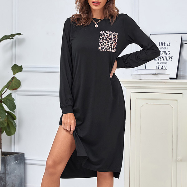 Fashion Long Sleeve Round Neck Leopard Pocket Slit Hem Loose Dress