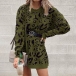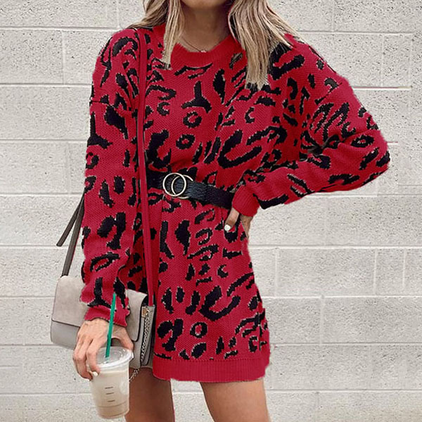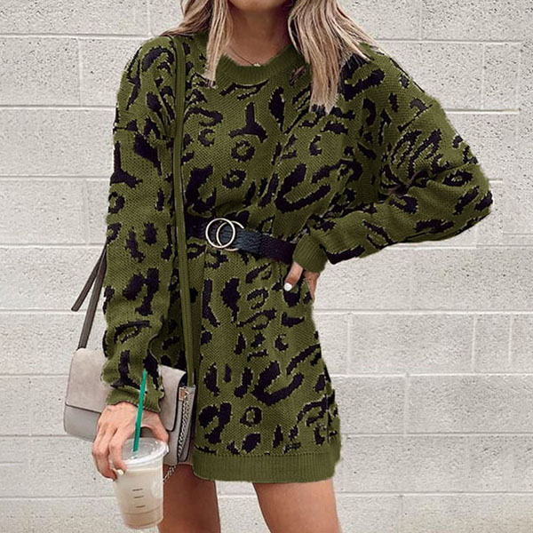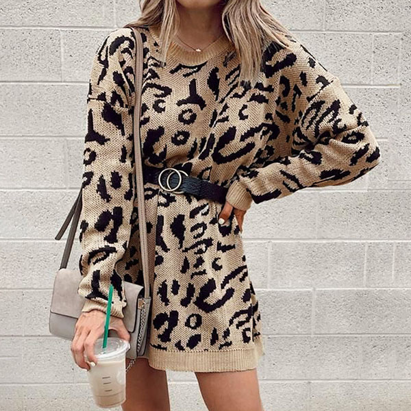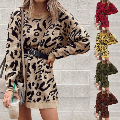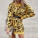 Fashion Long Sleeve Round Neck Leopard Printed Sweater Dress