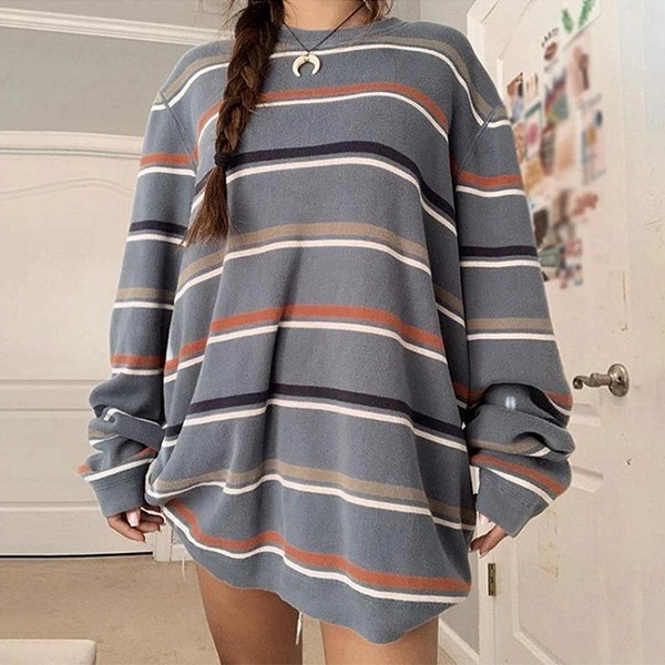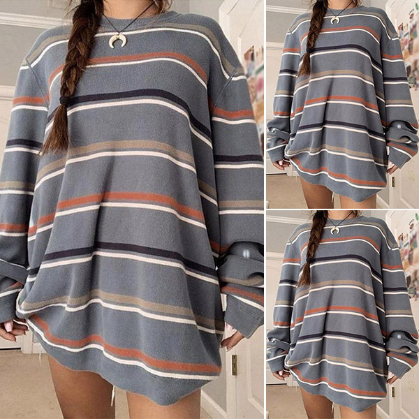Fashion Long Sleeve Round Neck Loose Striped Knit Top