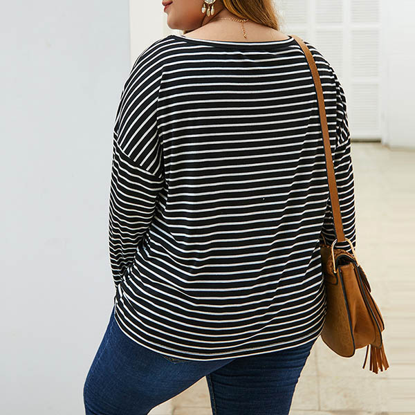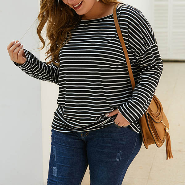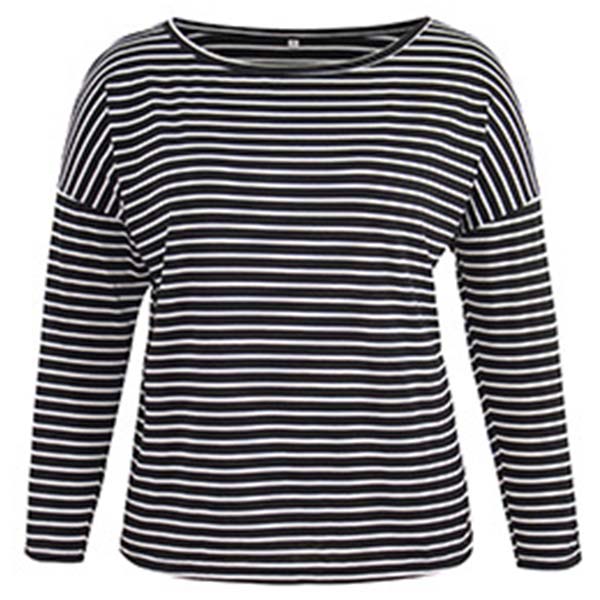 Fashion Long Sleeve Round Neck Plus-size Striped T-shirt