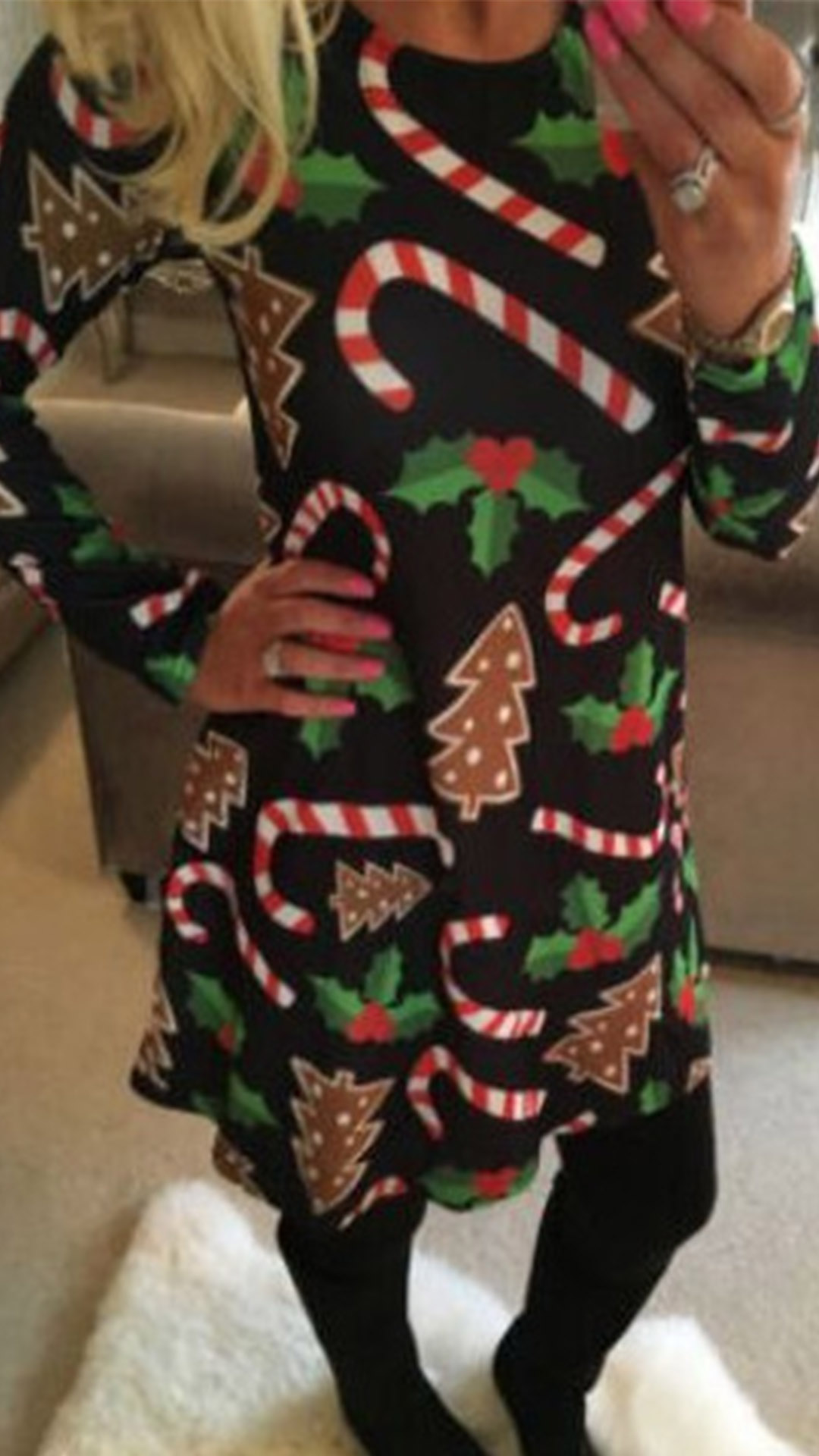 Fashion Long Sleeve Round Neck Printed Christmas Dress