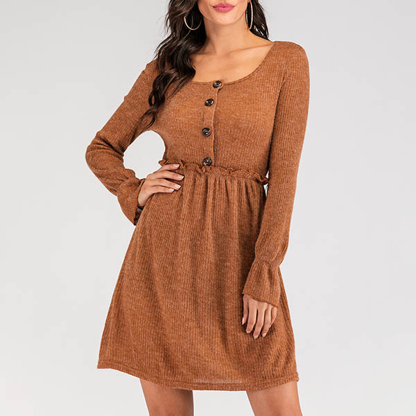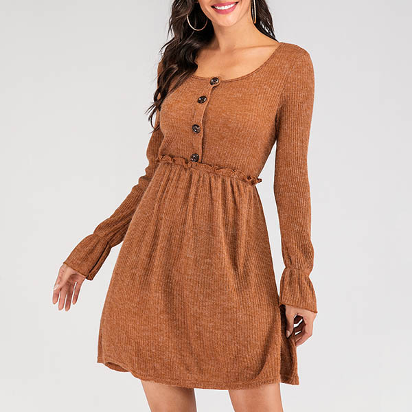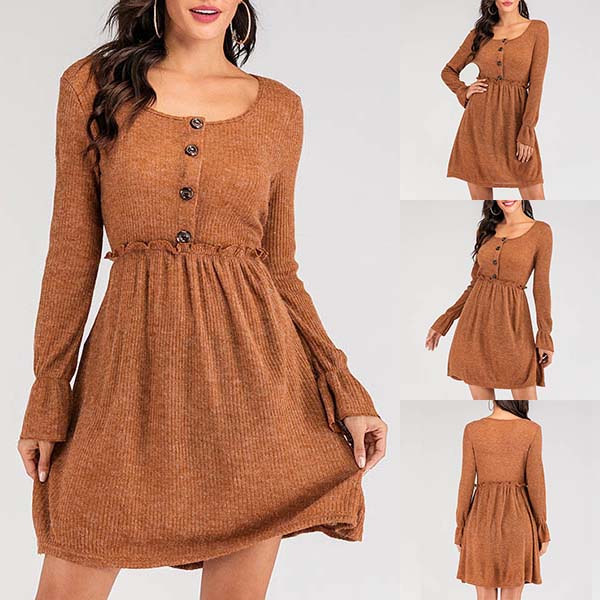 In these early autumn season,this cozy yet stylish knit dress can easily strike your mind. Finished with long sleeve,round neck and cozy fabric,this piece can ensure you a comfortable day. The ruffle high waist design not only can showcase your slender figure,but also can enhance your feminine appeal. Like it? Then try it to update your style.