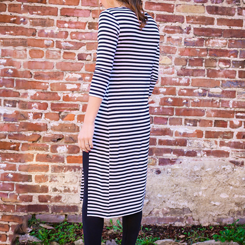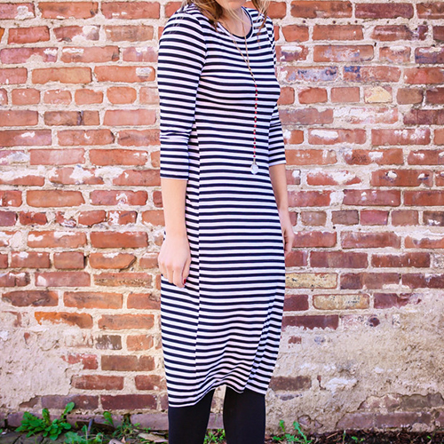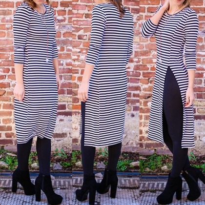 This dress features striped style,with long sleeve,round neck and a sleek silhouette,