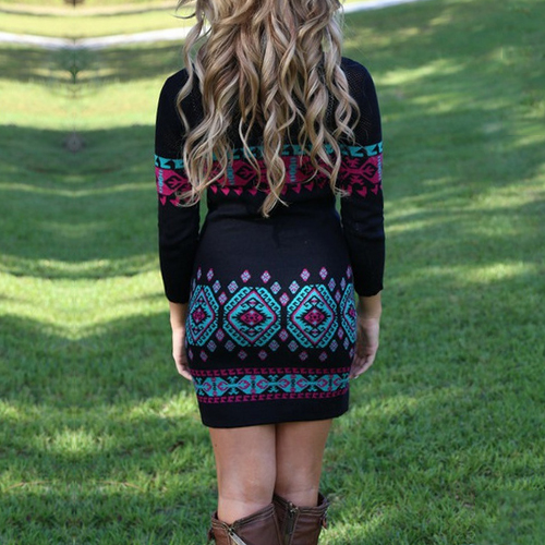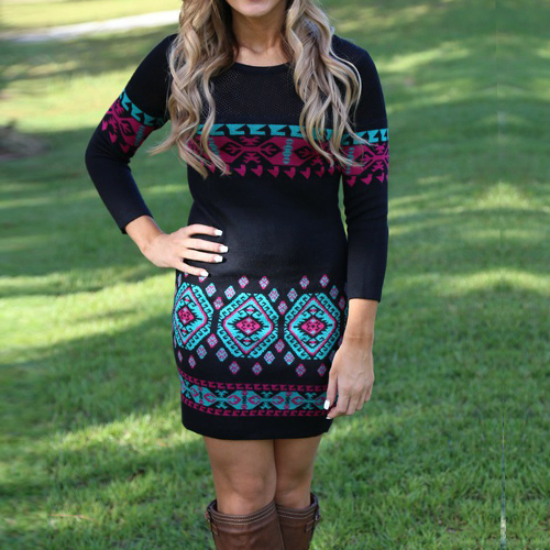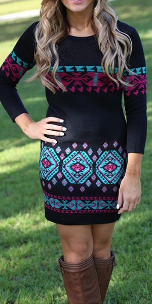 This dress features chic printed pattern,outfitted with long sleeve,round neck and a fit