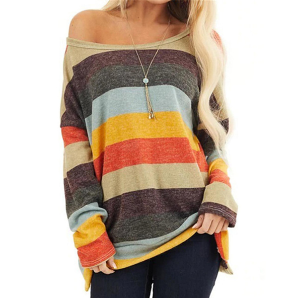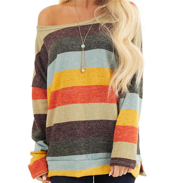Make your wardrobe look more colorful by adding this t-shirt. The colorful stripe element design makes this piece look so stylish and attractive. Finished with long sleeve,round neck and slit hem,this t-shirt can promise you a comfortable day with its soft and breathable fabric. It is just the thing you need on your casual days.