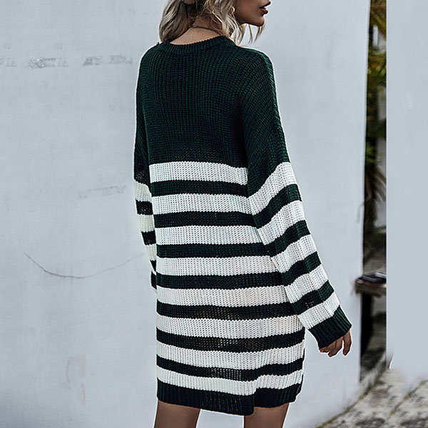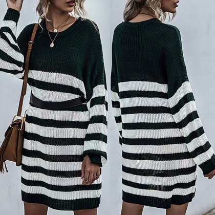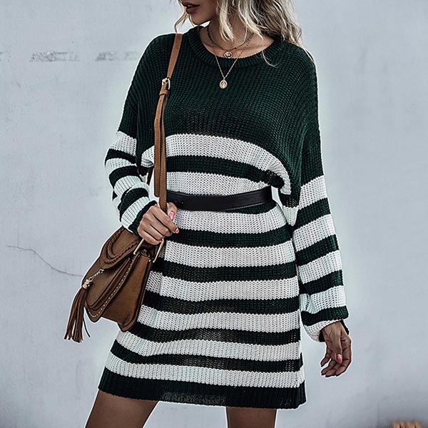 Fashion Long Sleeve Round Neck Striped Knit Dress