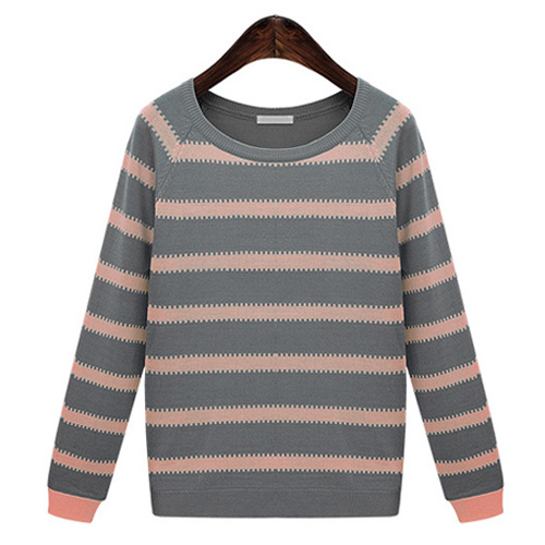 Fashion Long Sleeve Round Neck Striped Knitted Sweater