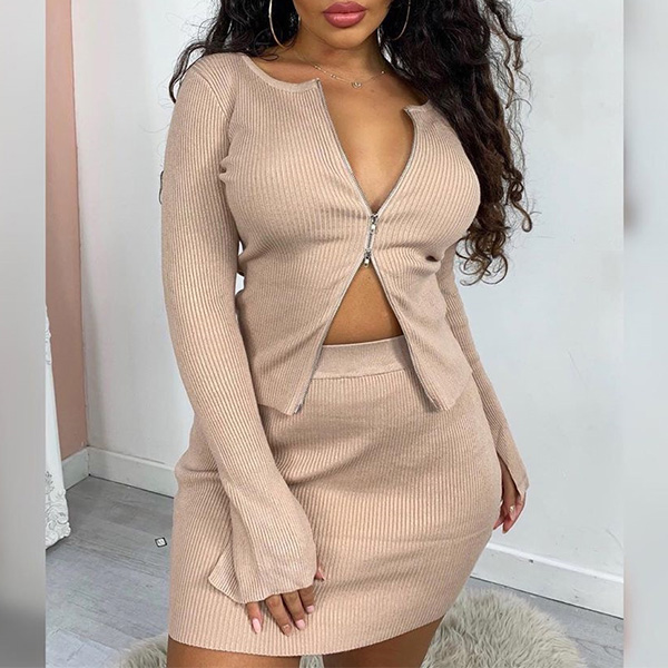 Fashion Long Sleeve Round Neck Zipper Top + Skirt Two-piece Set