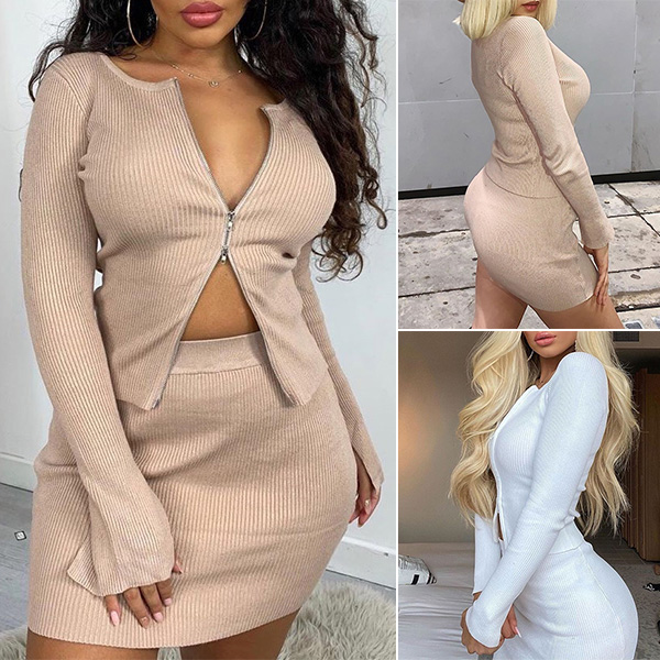 For a sexy and charming weekend look,you can dress yourself up with this two-piece set. Solid color style,including a long sleeve round neck top and a high waist skirt,this two-piece set not only can showcase your perfect figure,but also can enhance your feminine appeal. Moreover,the zipper design makes it look more distinctive. Like them? Then buy one set!