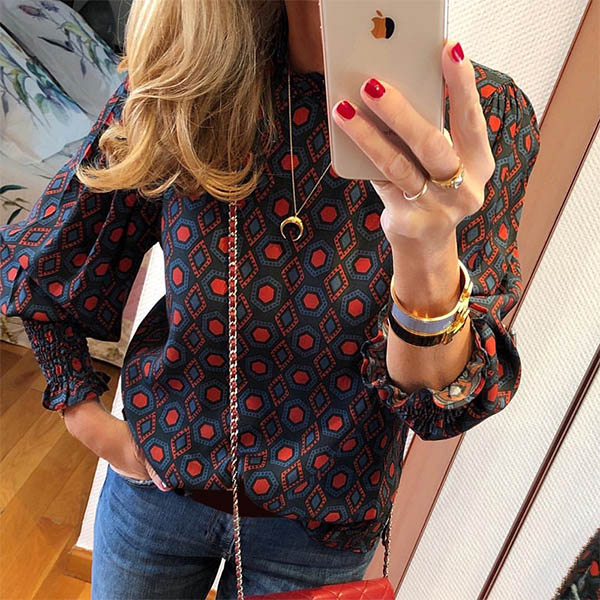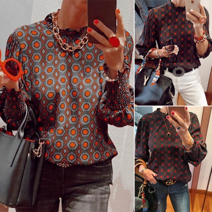Finish a delicate yet stylish daily look with the help of this wonderful blouse. Its chic printed details make this piece look more eye-catching,while the ruffle stand collar design will add some extra feminine appeal. o matter what kind of bottoms you pair with,it can hardly go wrong!