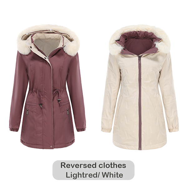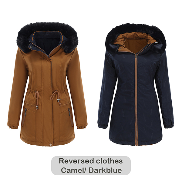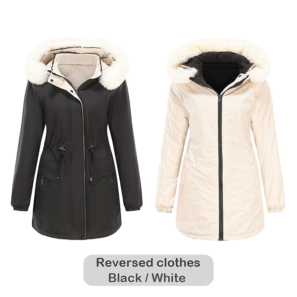 Fashion Long Sleeve Stand Collar Drawstring Waist Detachable Plush Spliced Hooded Reversible-wear Jacket