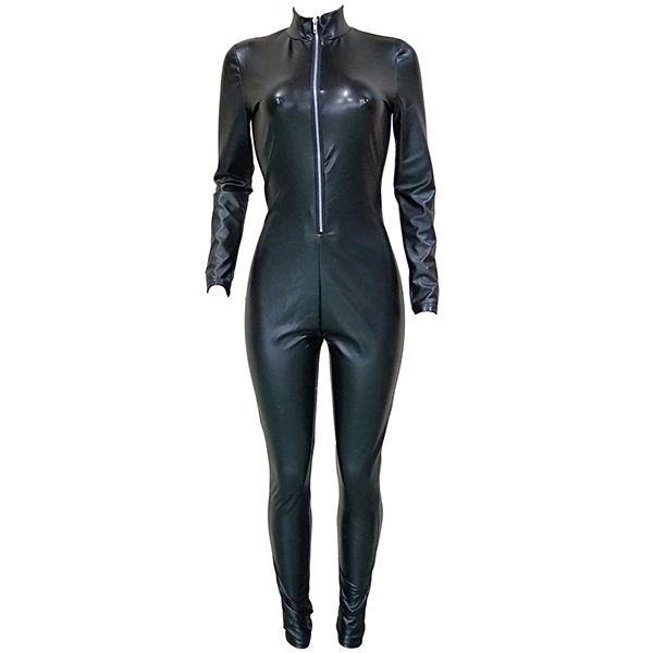 This PU leather jumpsuit boasts a classic,flattering black tone,finished with high waist and a fit silhouette,which can be the perfect chance to showcase your slender figure. Finished with long sleeve,stand collar and front-zipper design,this jumpsuit would offer you a cool and fashionable daily look!