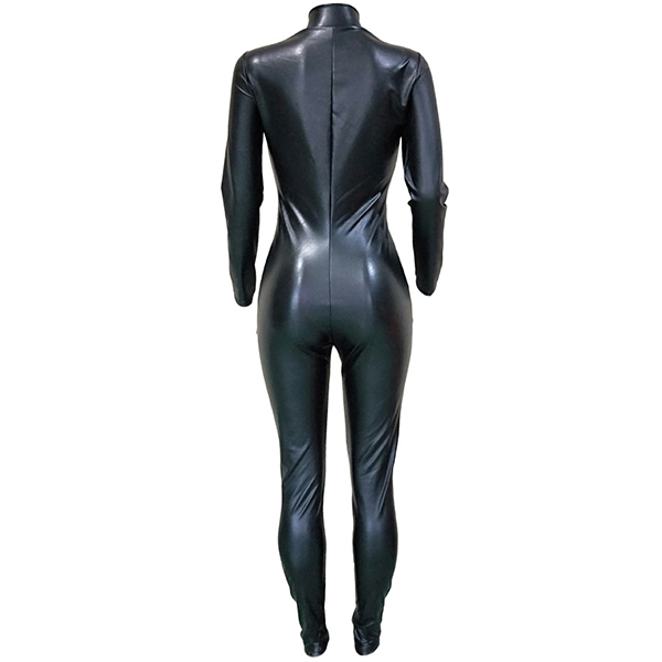 Fashion Long Sleeve Stand Collar High Waist Slim Fit PU Leather Jumpsuit