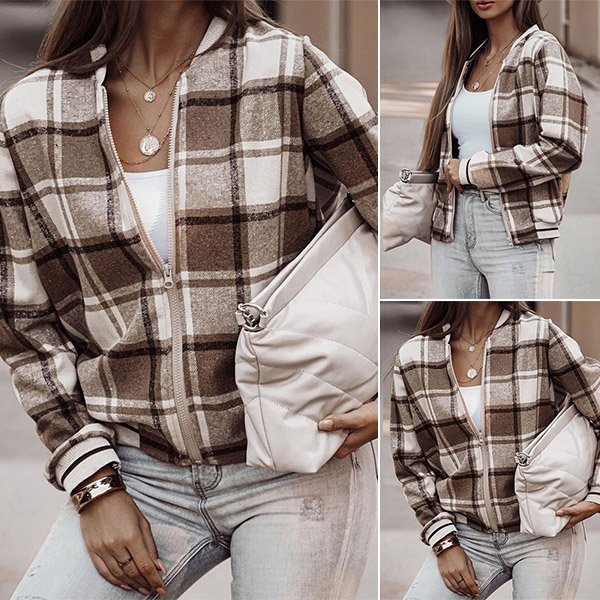 Fashion Long Sleeve Stand Collar Plaid Baseball Jacket