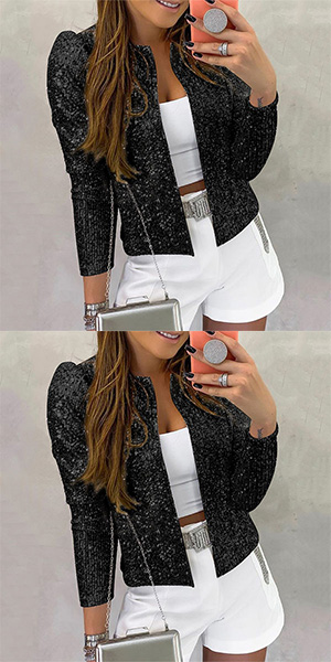 When you feel a little cold,you can just slip into this jacket to stay warm as well as maintain your style. It is finished with long sleeve,stand collar and a clean silhouette design,simple,delicate yet stylish. The sequin details will make it look more shinning and eye-catching. Perfect fit for matching with different style outfits.