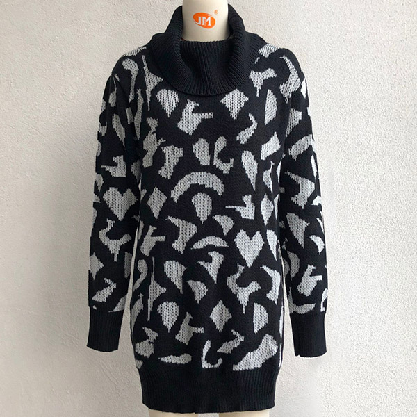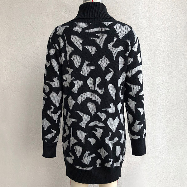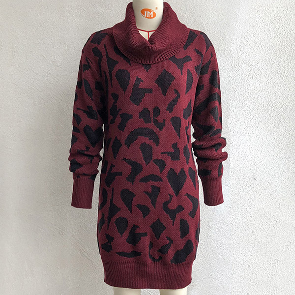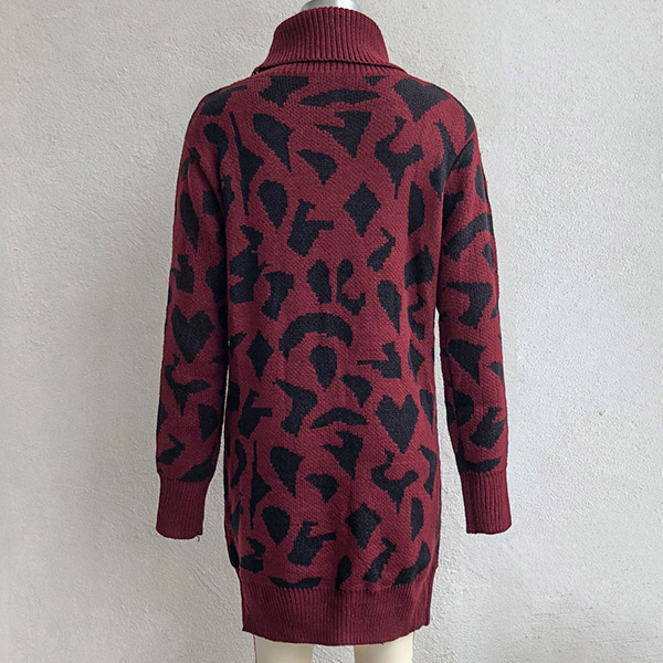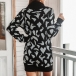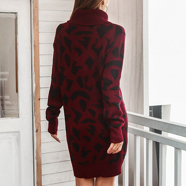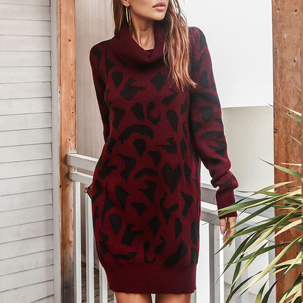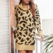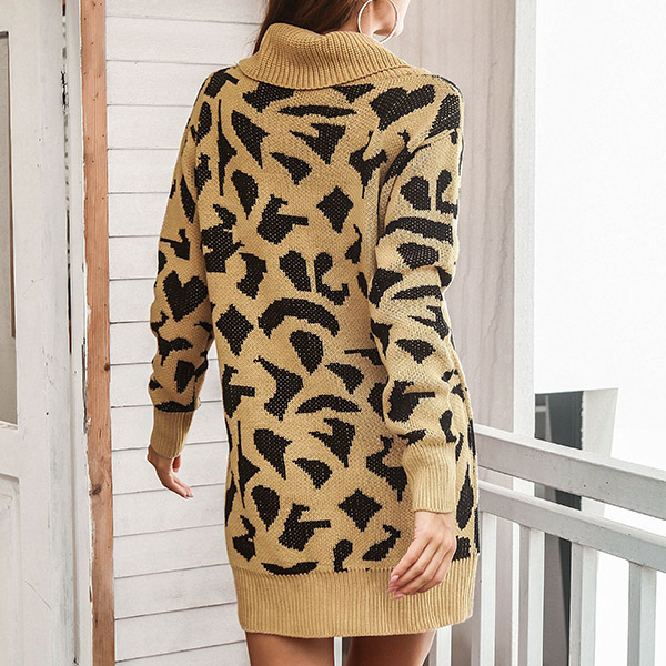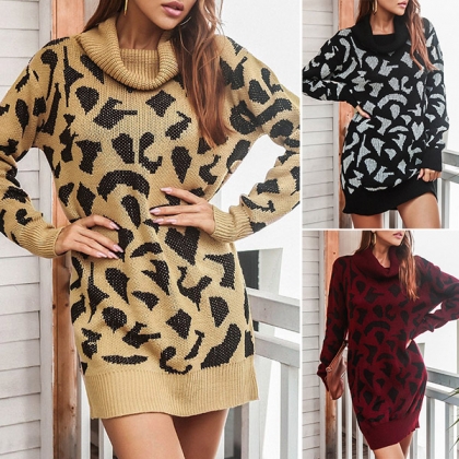 Fashion Long Sleeve Turtleneck Slim Fit Leopard Printed Knit Sweater Dress
