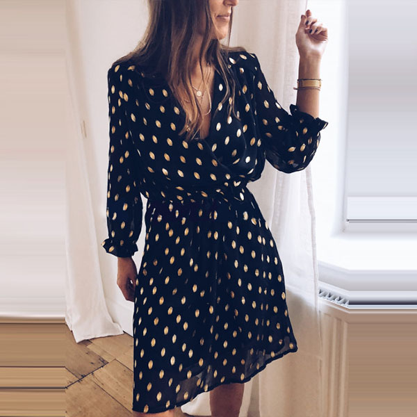 Fashion Long Sleeve V-neck Gold Dots Printed Dress