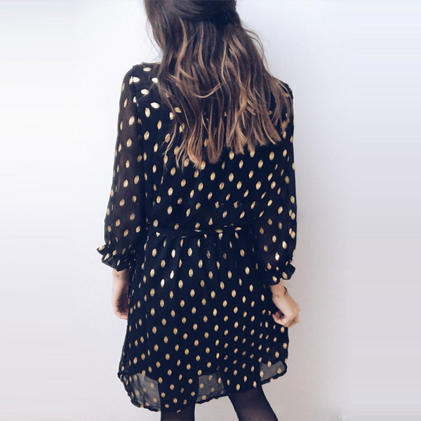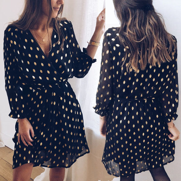 If there is one way to instantly give your image a style boost, it is by introducing this dress into your ensemble. the gold dots printed details make this piece look so eye-catching,while the v-neck design can exude your feminine appeal. For you night dating and weekend out,you can trust in this dress to make you look beautiful.