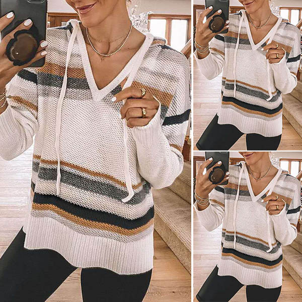 Fashion Long Sleeve V-neck Hooded Striped Sweater