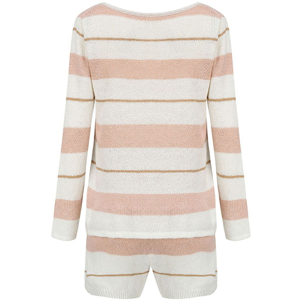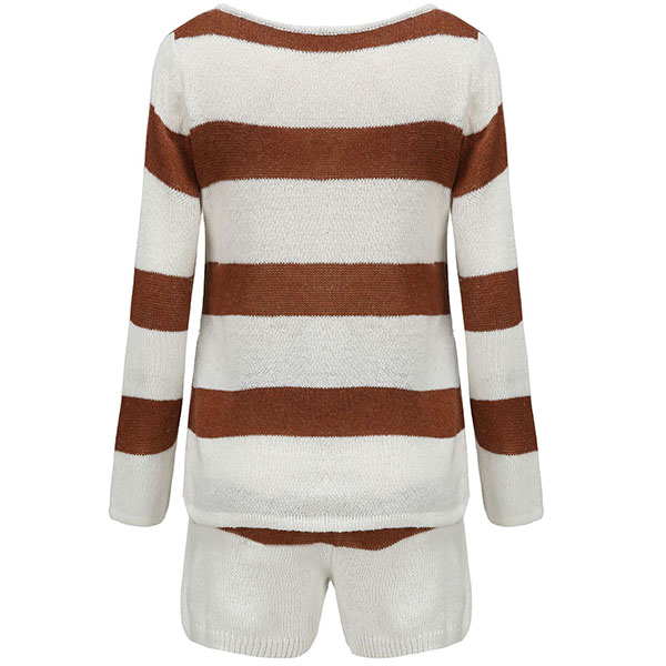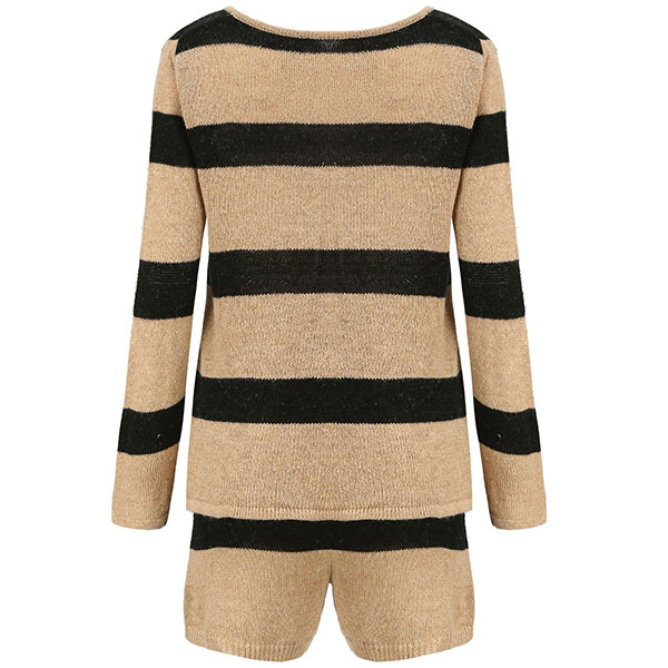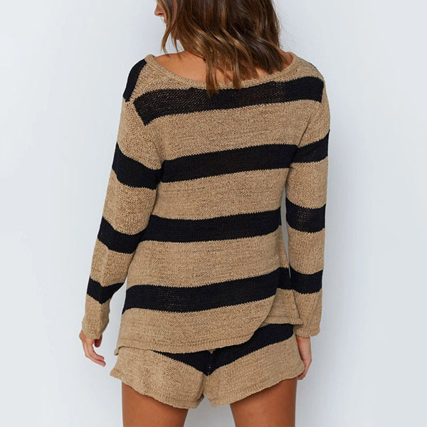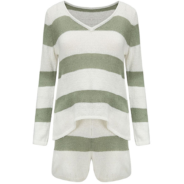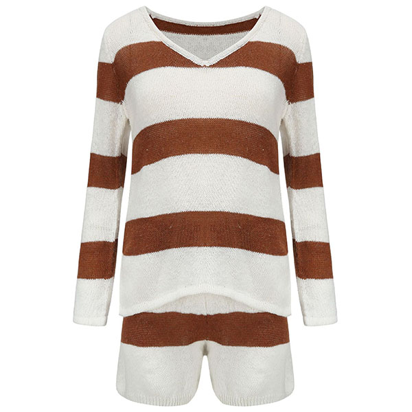 Fashion Long Sleeve V-neck Knit Striped Top + Shorts Two-piece Set
