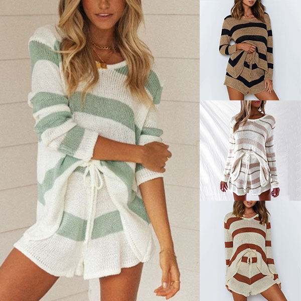 For these people who have no time to do their daily matching,then this two-piece set would be a perfect solution. Including a long sleeve v-neck striped top and a shorts,this two-piece set is a good way to exude your style and personality.