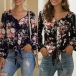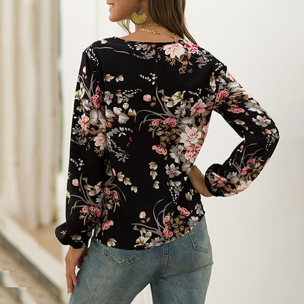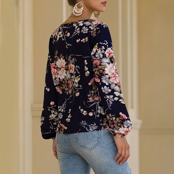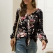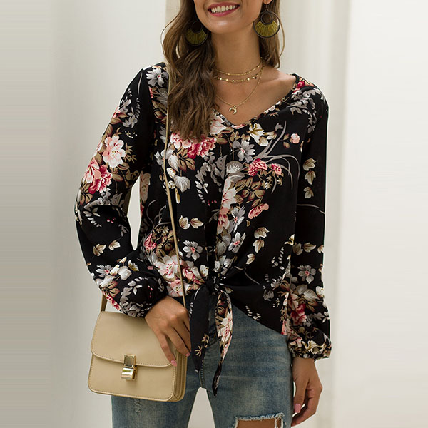 Fashion Long Sleeve V-neck Knotted Hem Printed Top