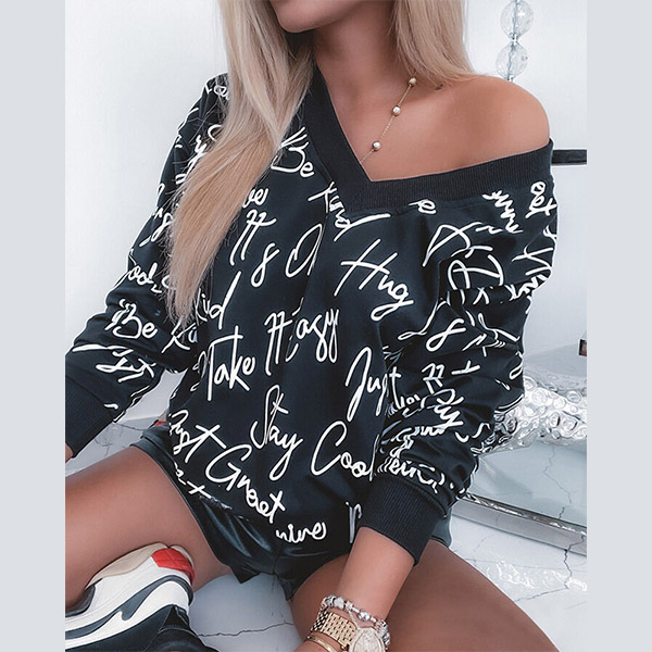 Fashion Long Sleeve V-neck Letters Printed Loose Sweatshirt