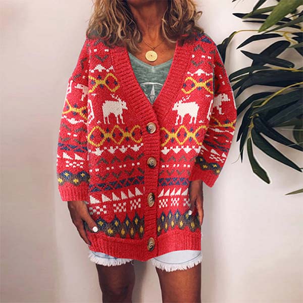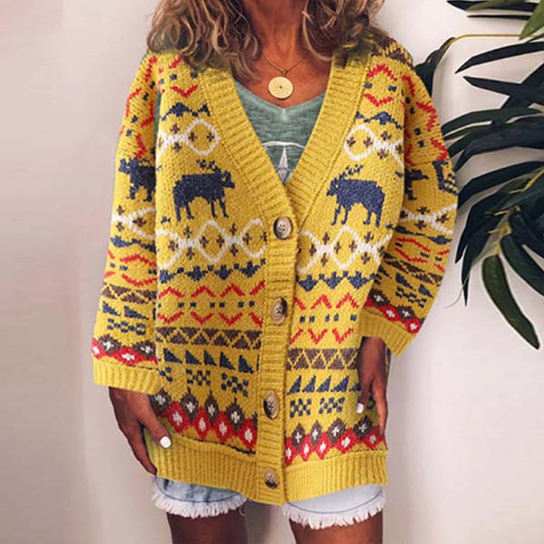 When the days get cold,this knit cardigan is worth to arouse your attention. The colorful printed details make this piece look so eye-catching. Finished with long sleeve,v-neck and front button design,this piece can keep you warm while it maintains your style.