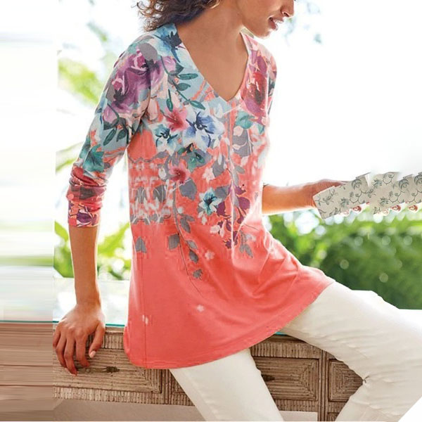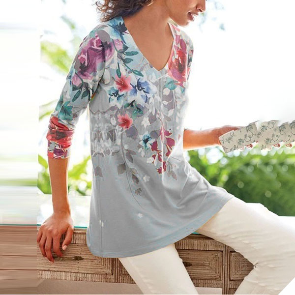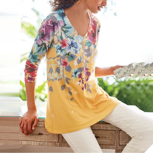 Only need one glance,you would fall in love with this beautiful t-shirt. Its vibrant floral print details make this piece look so attractive. Crafted from soft and breathable fabric,with long sleeve and v-neck design,this wonderful piece also can ensure you a comfortable day. Add a dash of colorful vibes to your wardrobe with this t-shirt!