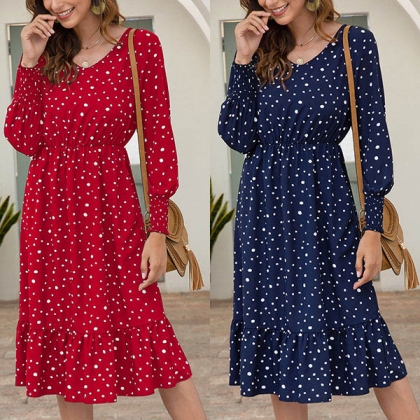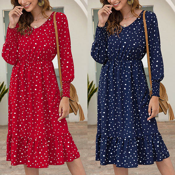 Catch the envious eye of everyone when you go out with this beautiful dress. It is finished with long sleeve,v-neck and ruffle hem design,which can easily enhance your feminine appeal,while the dots printed details will offer you a more playful and charming style. Inviting this dress to your wardrobe would be a wise choice.