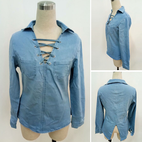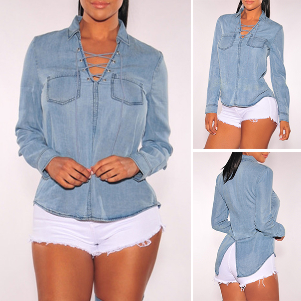 with long sleeve,v-neck,slit hem chest pockets,classic yet edgy and stylish,this denim blouse is sure to give you a