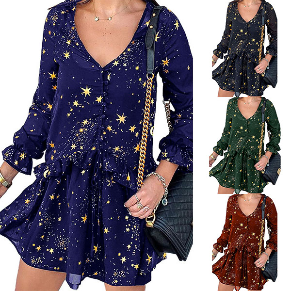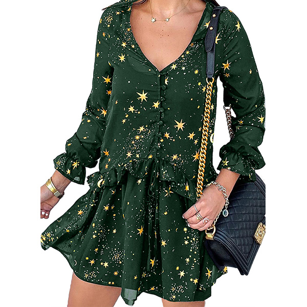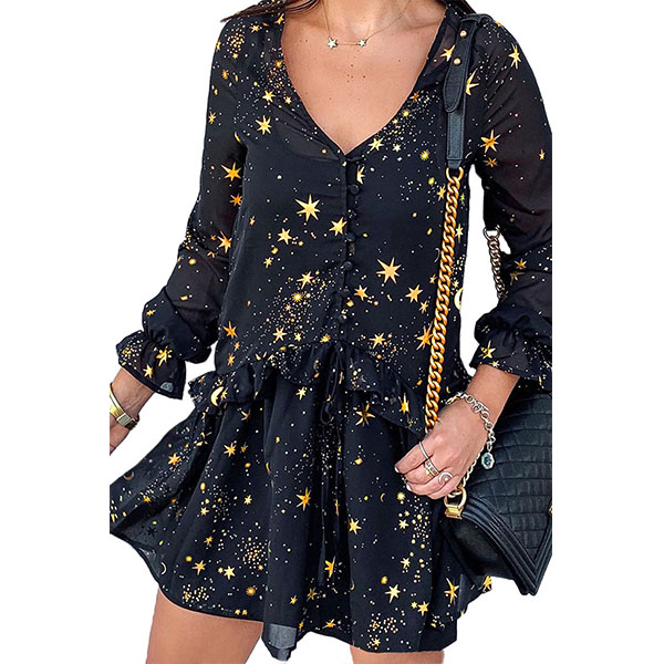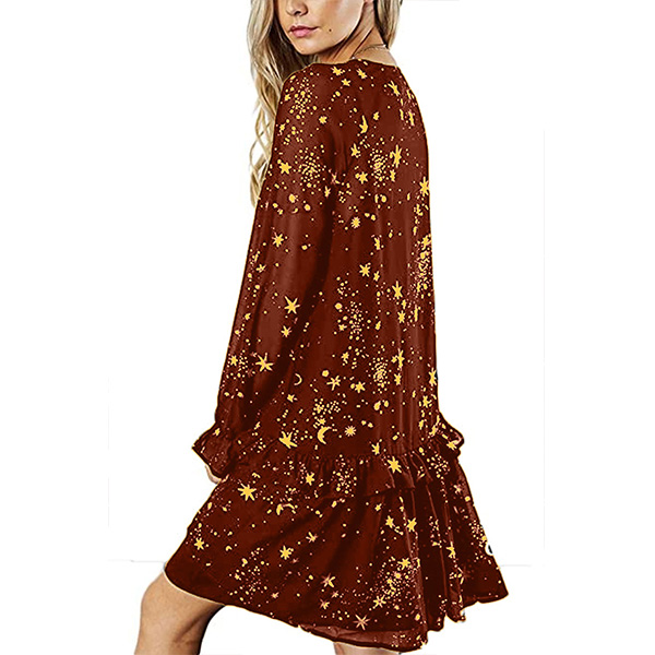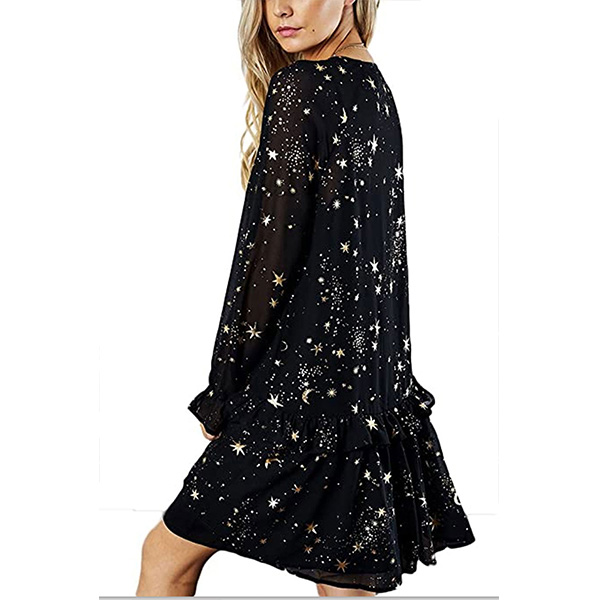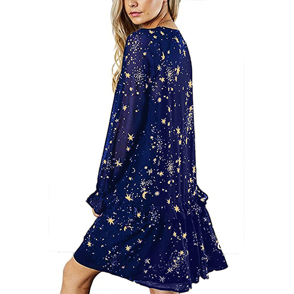 A dreamy, relaxed piece perfect for beach days, tropical getaways, or for just channeling an easy going vacation state of mind, this dress is the perfect choice. The star printed details make this piece look more eye-catching and romantic. Finished with long sleeve and v-neck design,this dress can make you look beautiful and charming.