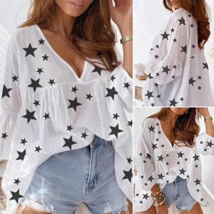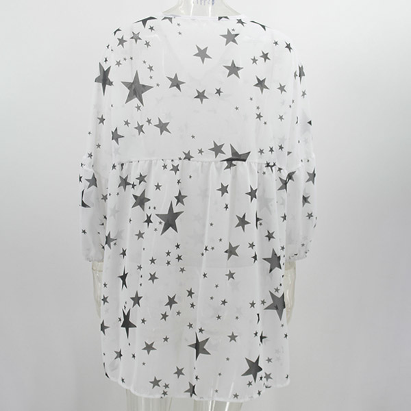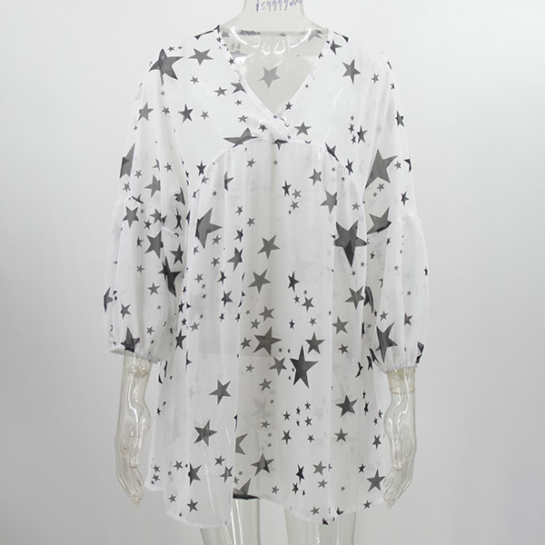 Fashion Long Sleeve V-neck Star Printed Loose Chiffon Top