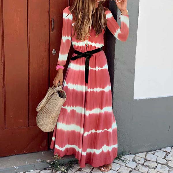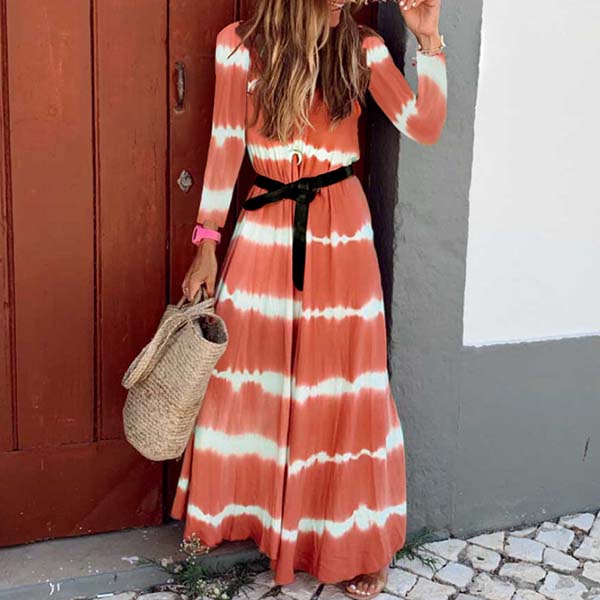 Fashion Long Sleeve V-neck Striped Maxi Dress