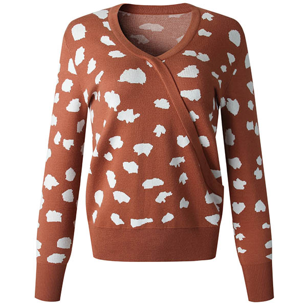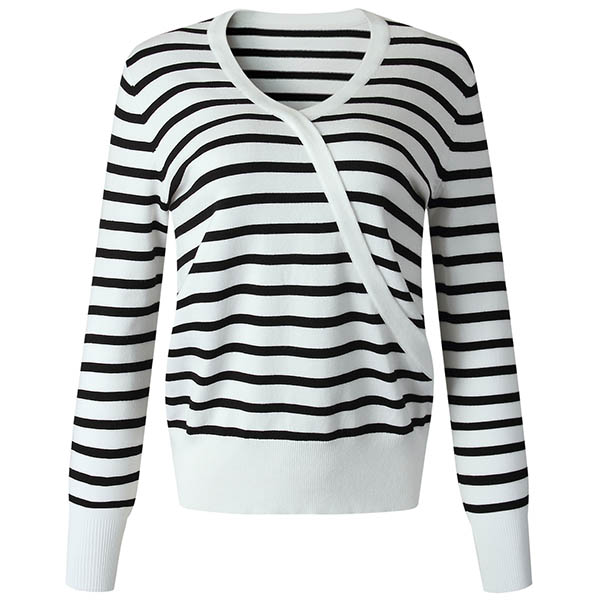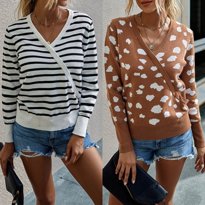Give your wardrobe a seasonal update by adding this knit top. The stripe/leopard printed details make this piece look so stylish and attractive,while the v-neck design will add some extra charm. You can match it with your shorts,skirts or jeans to start your wonderful day.