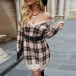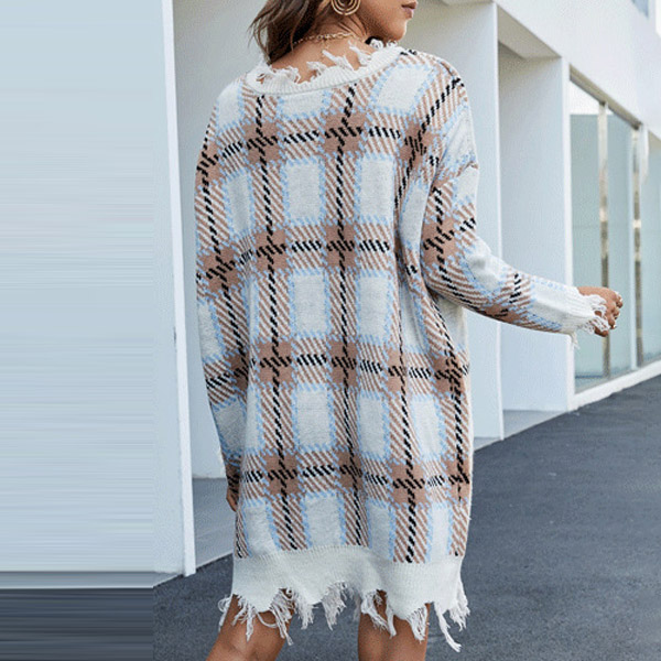 Fashion Long Sleeve V-neck Tassel Spliced Plaid Dress